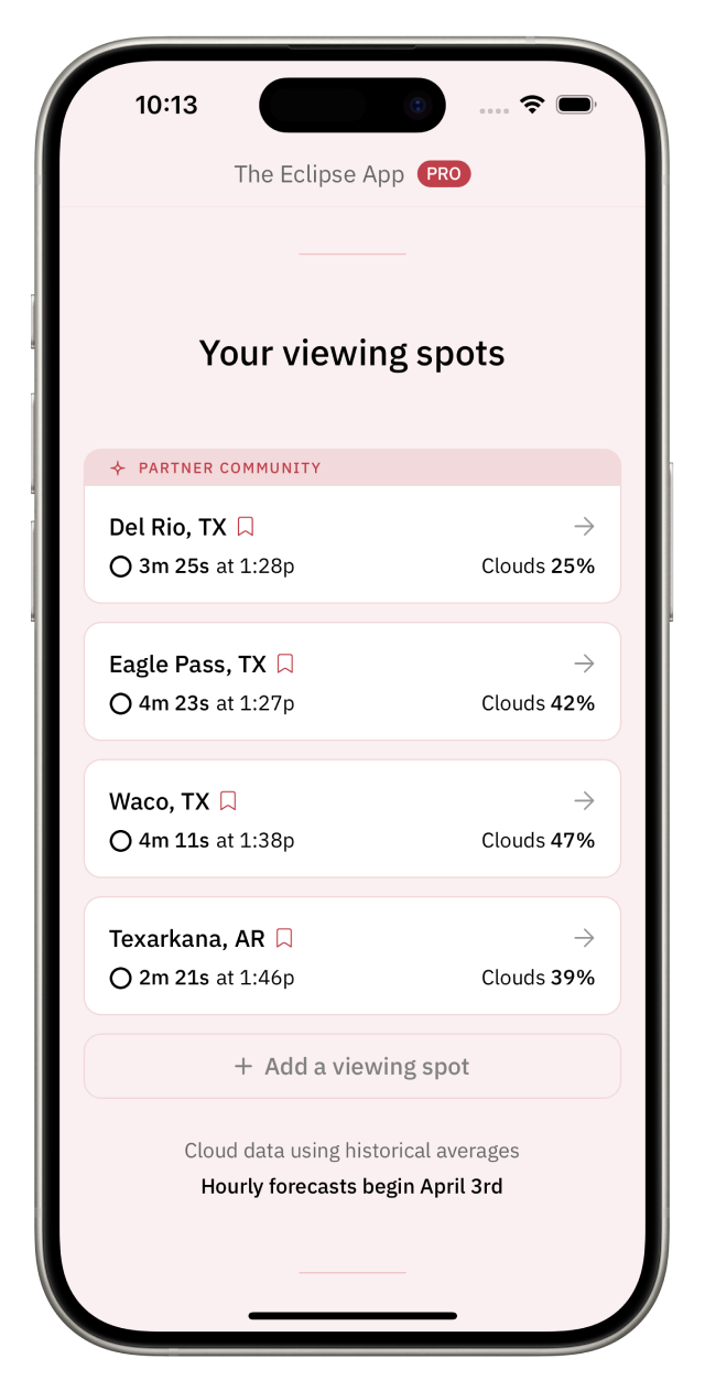 Avoid cloudy skiesCompare forecasted cloud cover across locations during the hour of totality.